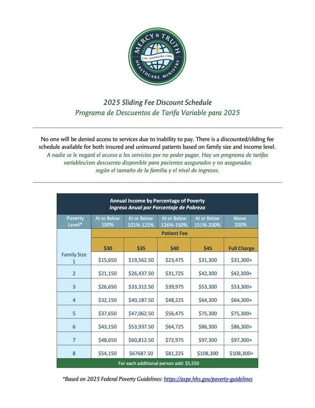 No one will be denied access to services due to inability to pay. There is a discounted/sliding fee schedule available for both insured and uninsured patients based on family size and income level. (See chart or fill out this form.)